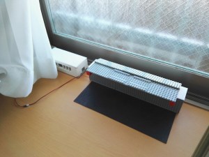 ファンは、カーテンと窓の間に設置します。空気の取り込み口は上面ですが、上面をレゴブロックで吹き出し口とは反対方向から取り込めるようにし、カーテンの室内側からの空気を取り込むようにしました。