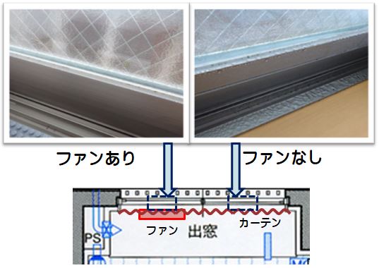 両部屋のファンを設置した窓について、窓全面が結露した日は0日、厳しい冷え込みの日でも一部(主に金属サッシ部)に結露が発生する程度(前年までは、10日以上全面結露が発生していた)だったため、かなり効果があったのではないかと思います。
