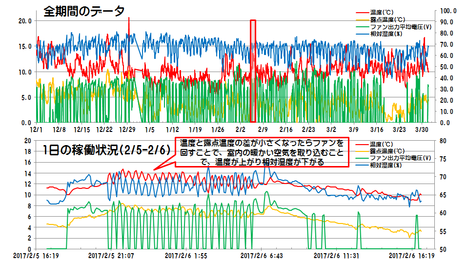 1日の稼働状況からは、2/5夕方から湿度が上がることで露点温度が上昇し、ファンが稼働していることが分かる。21時頃から翌日6時頃まではファンが稼働することで部屋の空気を窓とカーテンの間に取り込むことで温度が上がり、湿度が下がることでファンが停止、また湿度が上がるとファンの稼働を繰り返していることが分かる。