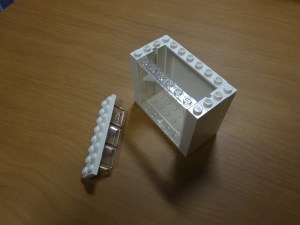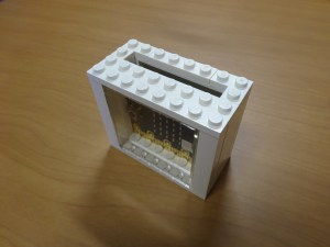 色は白で統一、使えそうなサイズのブロックを探していたところ、LEGO City の Police Station(7498) に入っていた 2×6 の溝の入った柱として使うブロックが高さが丁度良く、micro:bit の両側を挟んで上手く固定し、他のブロックと組み合わせきれいに作成できました。