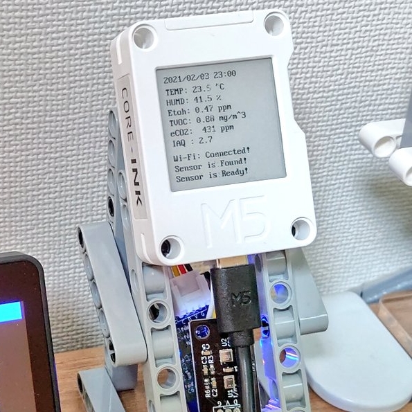 いつものように、レゴブロックで簡単なスタンドを作成、 エアクオリティセンサ基板は CoreInk の下に配置してみた。