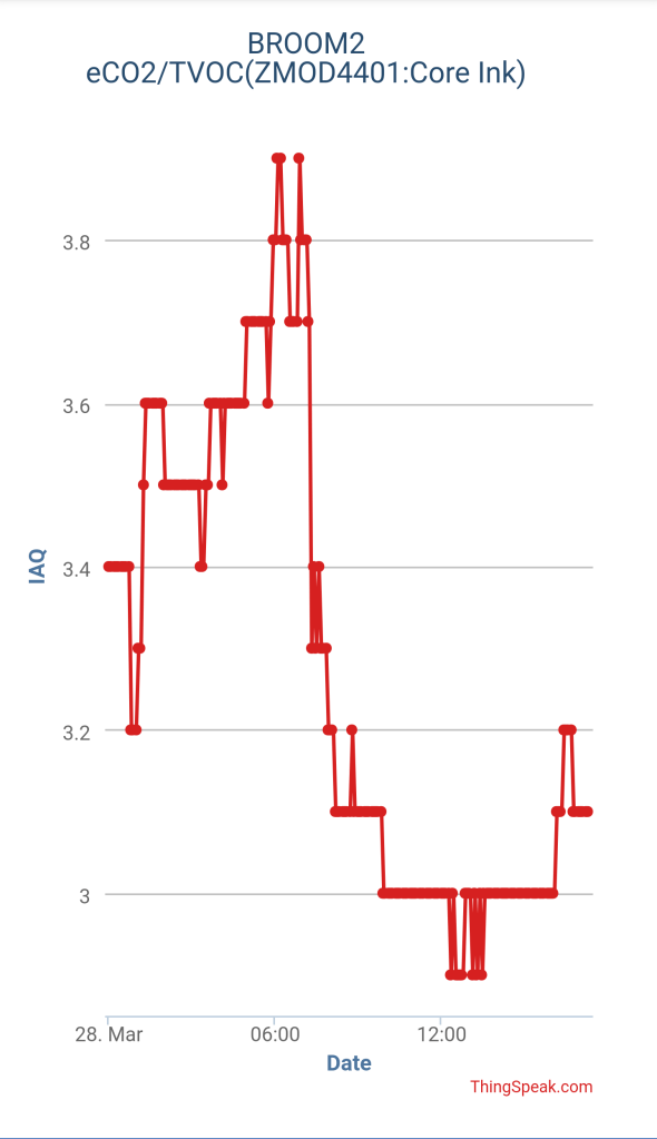 次のグラフは空気質の指標 IAQ の値、2未満が非常に良く、5以上は非常に悪いとのこと。