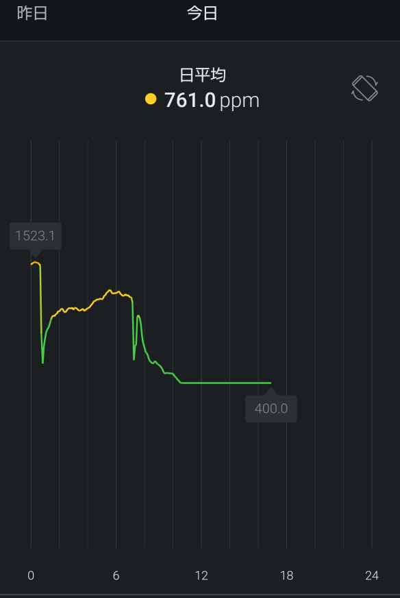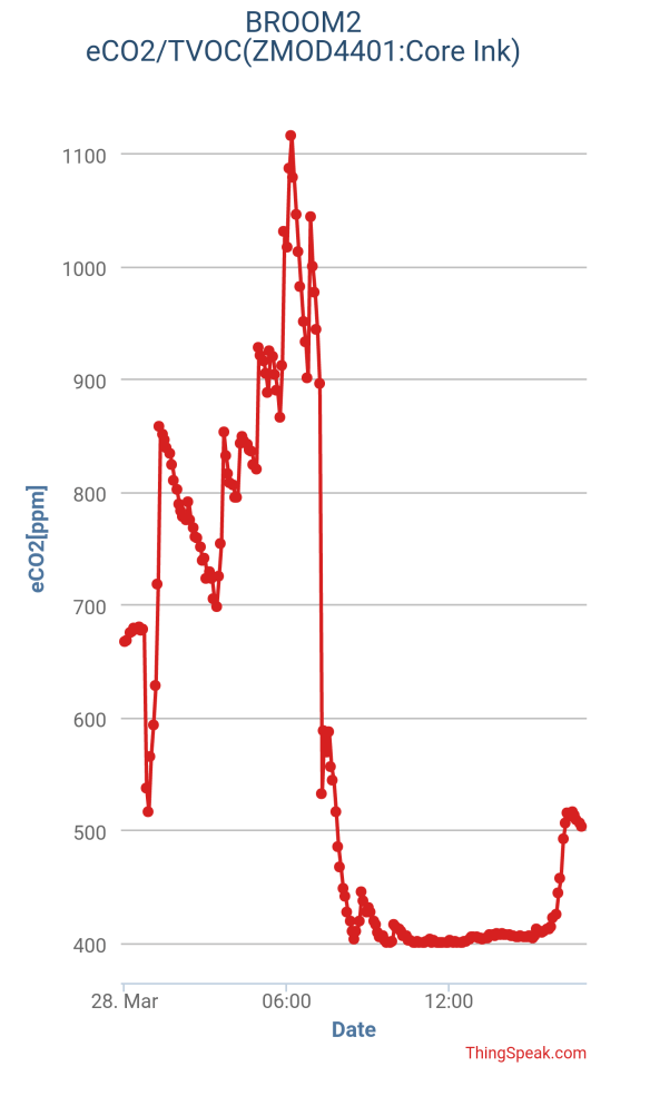 ただ、0時過ぎ辺りの比較では Awair が 1500ppm を超えているが、ZMOD4410 は 700ppm 以下と大きく異なることもある