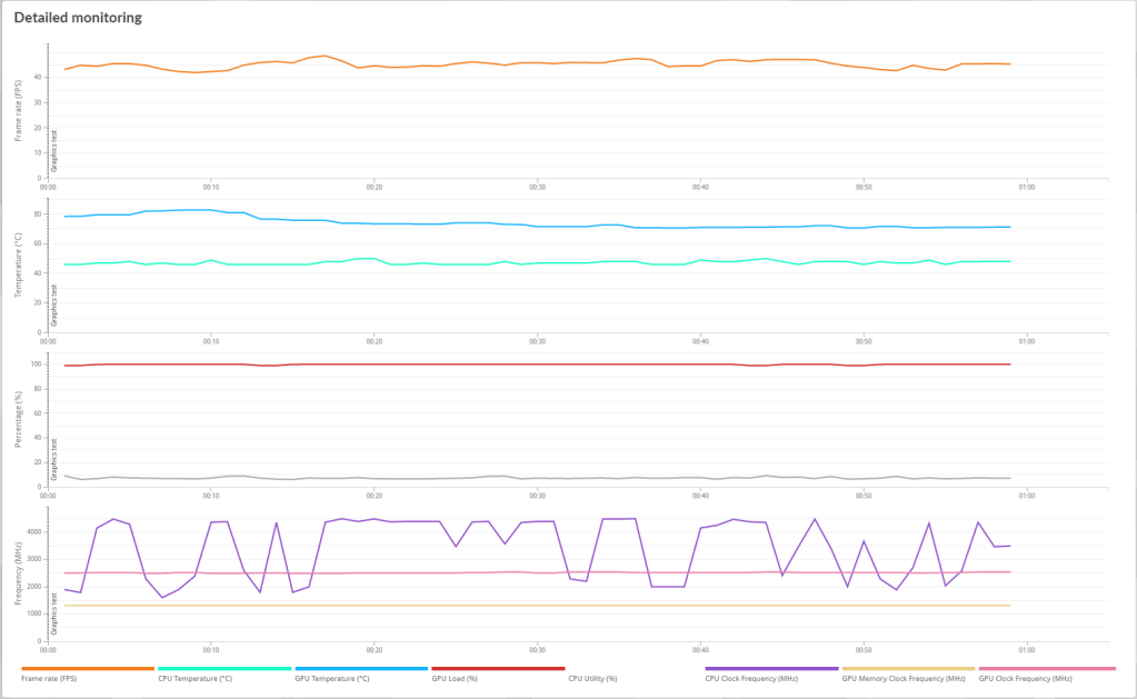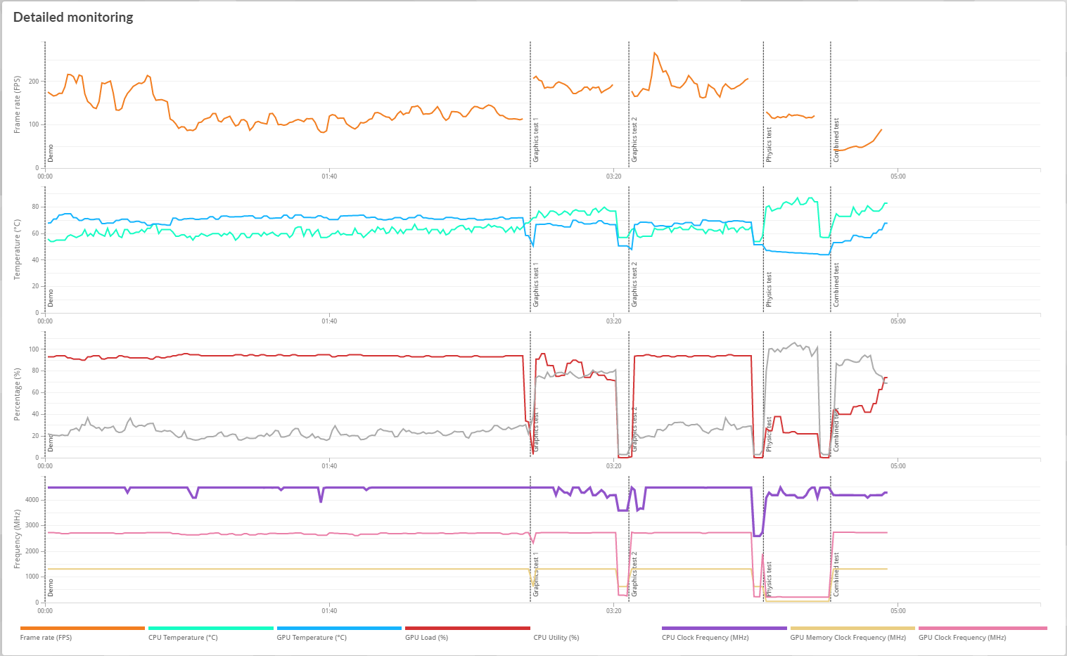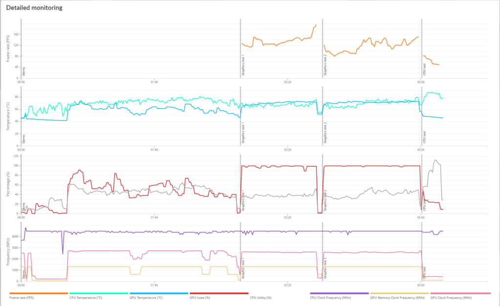 以下、フレームレート・CPU/GPUの温度・使用率・動作クロックの推移。