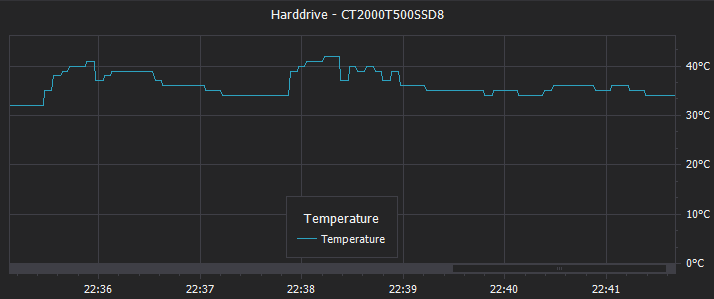 マザーボードAR900iはM.2 2280 PCIe4.0 SSDスロットをフロントに2つ、背面に2つ、計4つを備え、今回Crucial T500 2TBを搭載したフロント側はアクティブヒートシンクが標準で付属しているので、SEQ1M Q8T1 Read時で41℃、SEQ1M Q8T1 Write時で42℃と、しっかり冷却されている感じ。