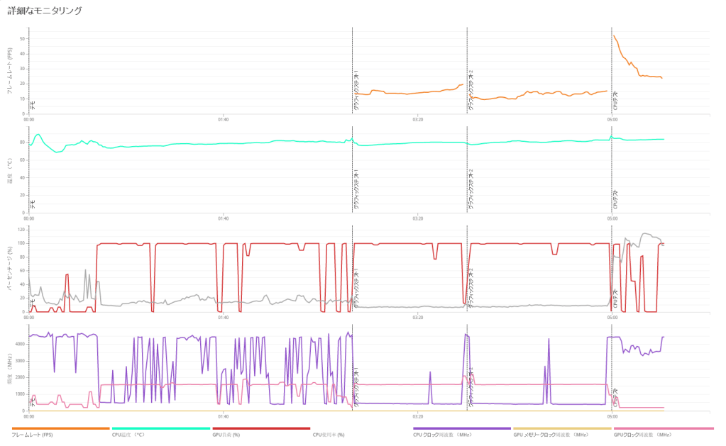 以下、フレームレート・CPU/GPUの温度・使用率・動作クロックの推移。