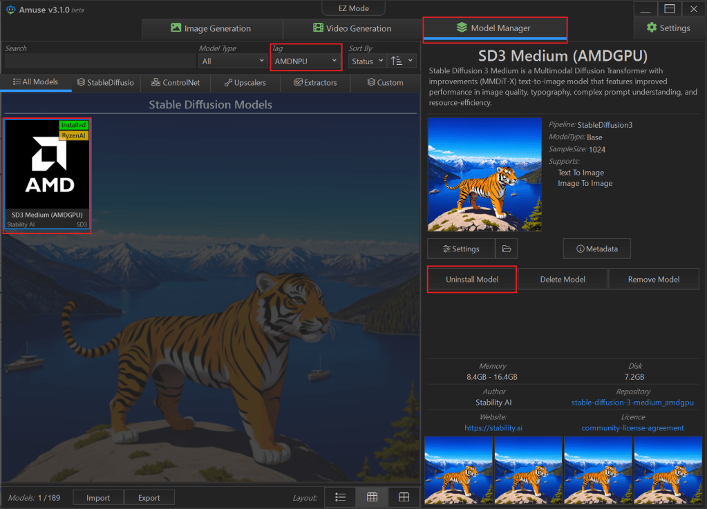 - [Model Manager]タブをクリック、[Tag]で[AMDNPU]を指定し、[SD3 Medium (AMDGPU)]をクリックし、[Download Model]をクリックしてダウンロード(7.8GB)