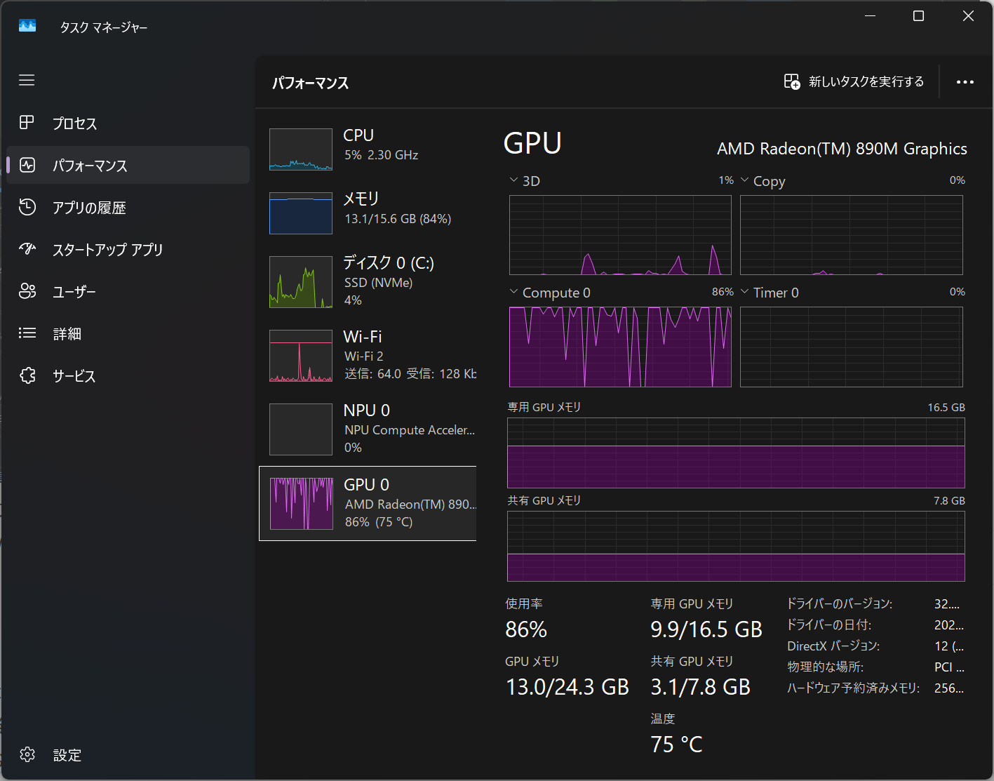 タスクマネージャーのパフォーマンスでGPUを確認するとCompute 0がほぼフル稼働していることが分かる。