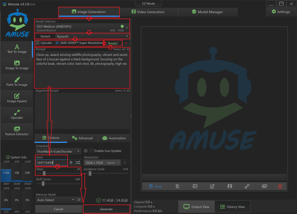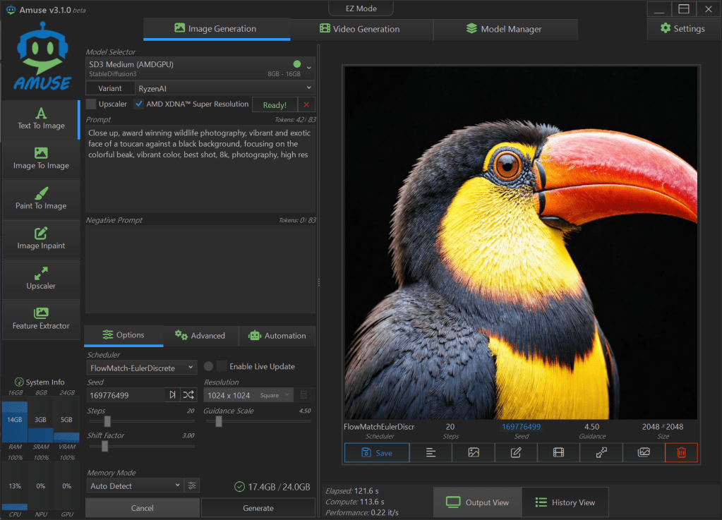 ブログにも記載がある通り、動作環境のハードウェア要件としてはAMD Ryzen™ AI 300 seriesまたは Ryzen™ AI MAX+搭載のPCで、メモリは少なくとも24GB必要とのこと。ソフトウェアは最新のAdrenalin Driverと、Amuse 3.1 Betaが必要。また、高品質な画像を生成するためのプロンプトのコツについても説明されている。