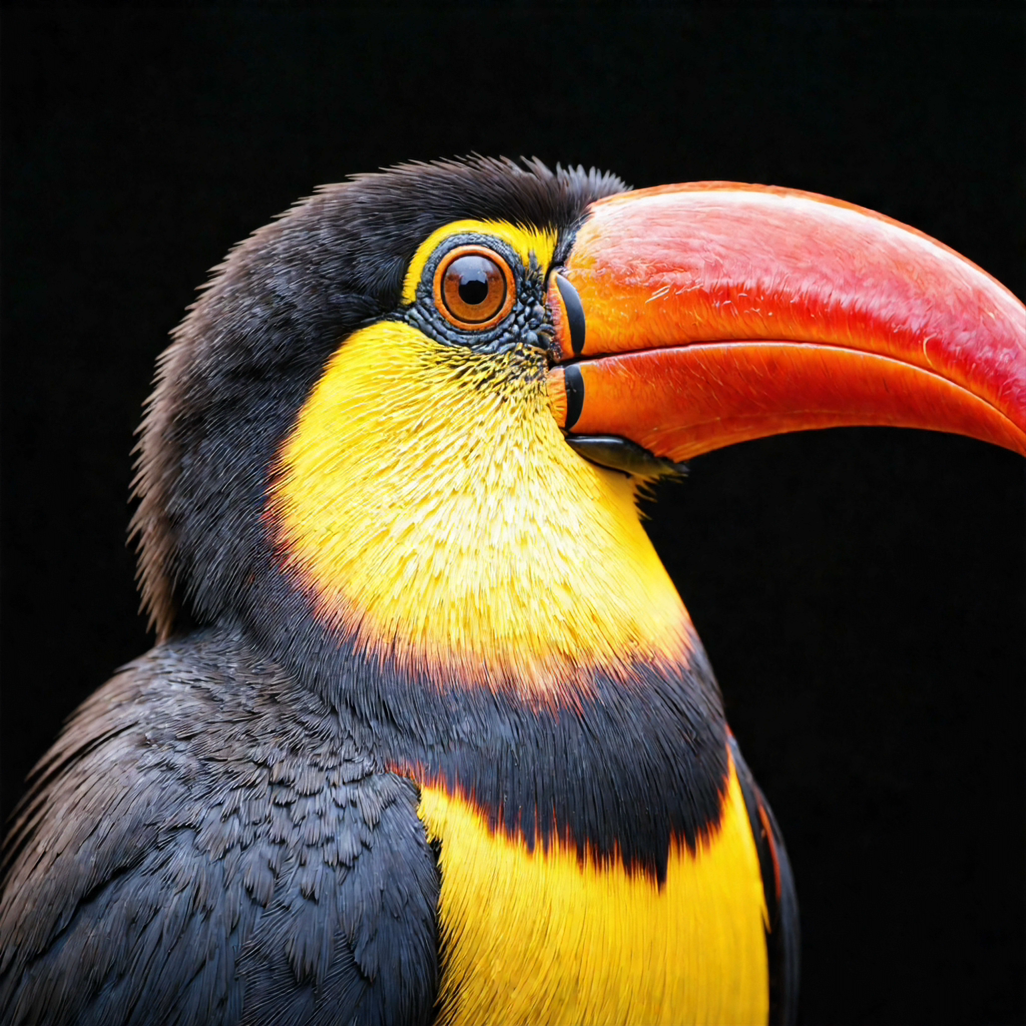 Close up, award winning wildlife photography, vibrant and exotic face of a toucan against a black background, focusing on the colorful beak, vibrant color, best shot, 8k, photography, high res - [Steps]は[20]を指定、[Seed]は[169776499]を指定、[Resolution]は[1024 x 1024]が指定されていることを確認、その他の設定は特に変更せず[Generate]ボタンをクリック