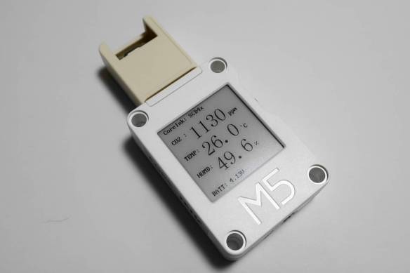 CoreInk での使用例、電子ペーパーディスプレイで見易く、省電力のため内蔵バッテリーのみで約2週間の動作(10分間隔更新の場合)が可能なため、CO2モニターとして最適です。