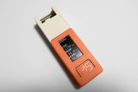 M5StickC での使用例、カラーLCD を搭載しているため、CO2濃度/温度/相対湿度の値に応じて注意レベルを3段階の色(緑/オレンジ/赤)で分かり易く表示したりすることが可能です。