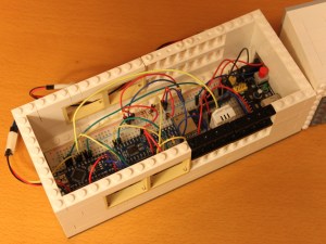 Arduinoと温湿度センサーでファンを制御、ケースはレゴブロックで作成しています。写真左側のセンサーボックス内の温湿度センサーで結露になりそうな状況を判断し、右側のクロスフローファンを制御することで、窓とカーテンとの間の停滞した空気を循環させ、結露が起こりにくい環境にします。
