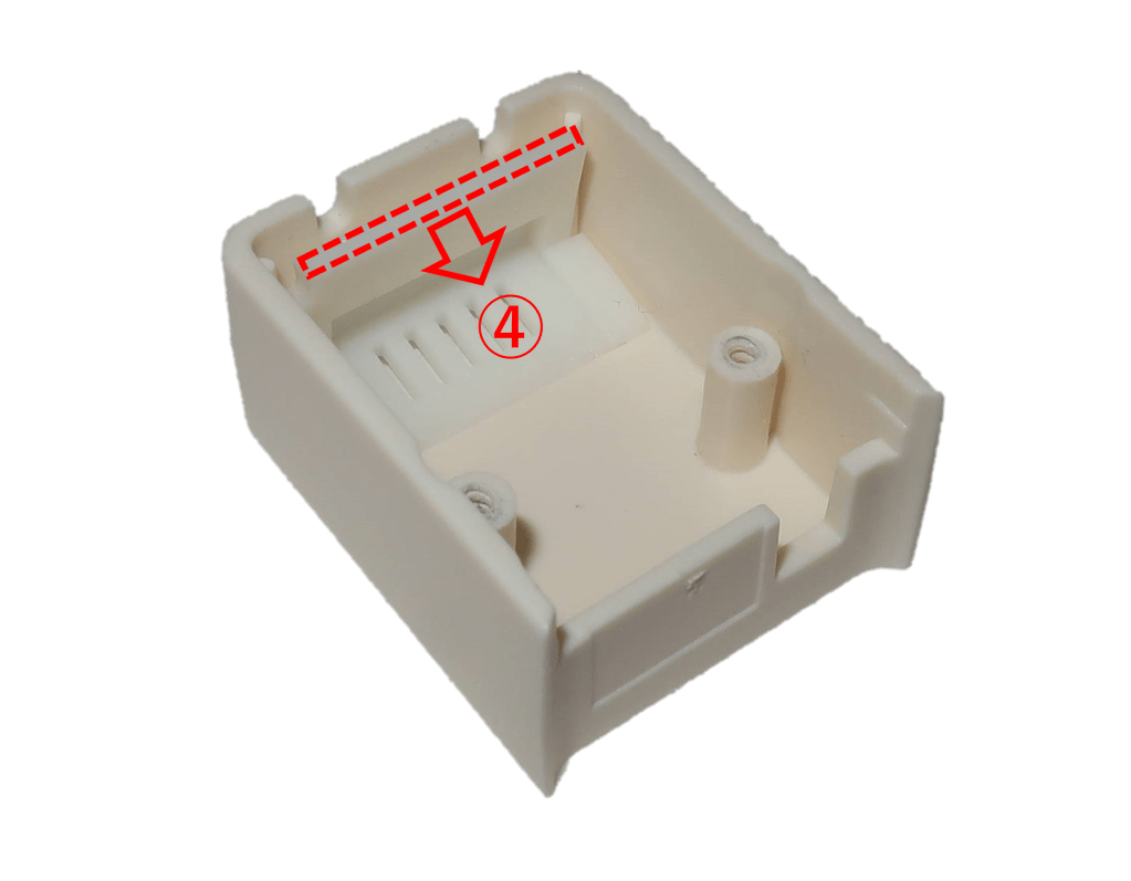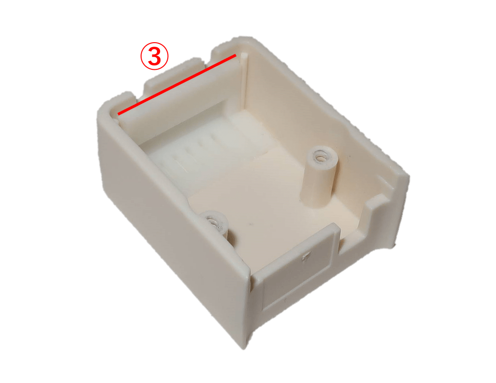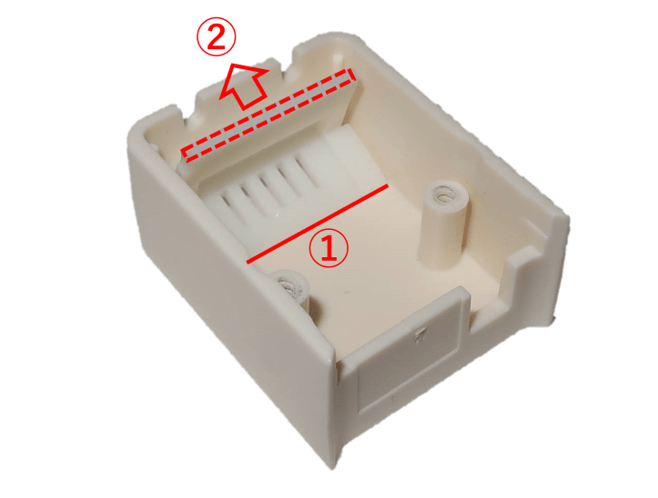 取り付け説明画像Aのように、スリットのある面を下にして①のように揃えます。続いてカバーの点線部分を②の方向に押し込むと、カチッと音がして取り付け画像Bのようにぴったりと収まります(③の隙間が無い状態)。